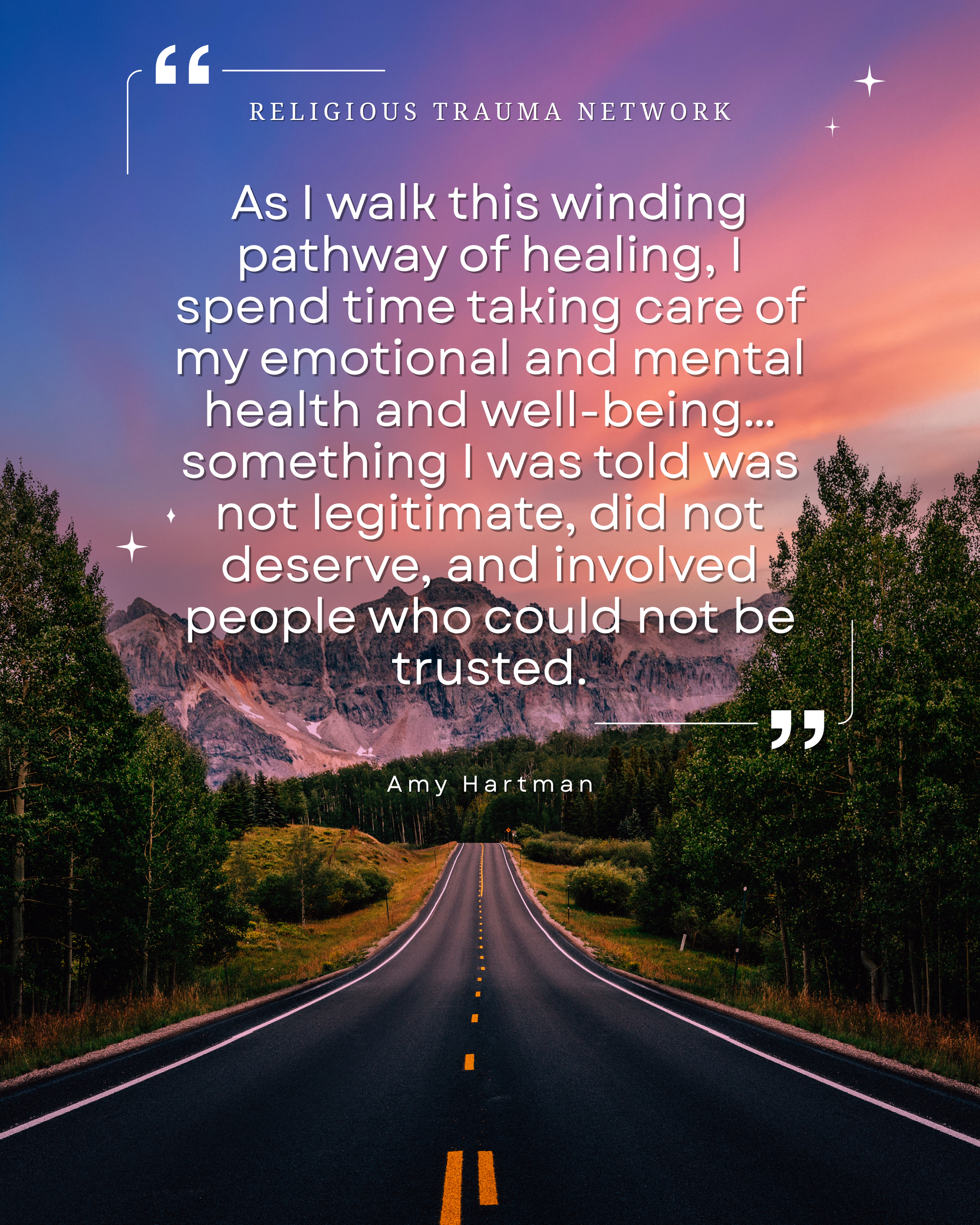 Amy Hartman is a survivor of over 3 decades of spiritual abuse and over 2 decades of clergy abuse. Having walked out of a high-control religious system disguised as a church, she has a passion for telling her story in order to connect with and inspire others to find their own way. She serves her community in her volunteer work and in her occupation as an Ombuds. She practices the tenets of transformative mediation in an effort to help parties find and use their voices – something she was not free to do for so long.